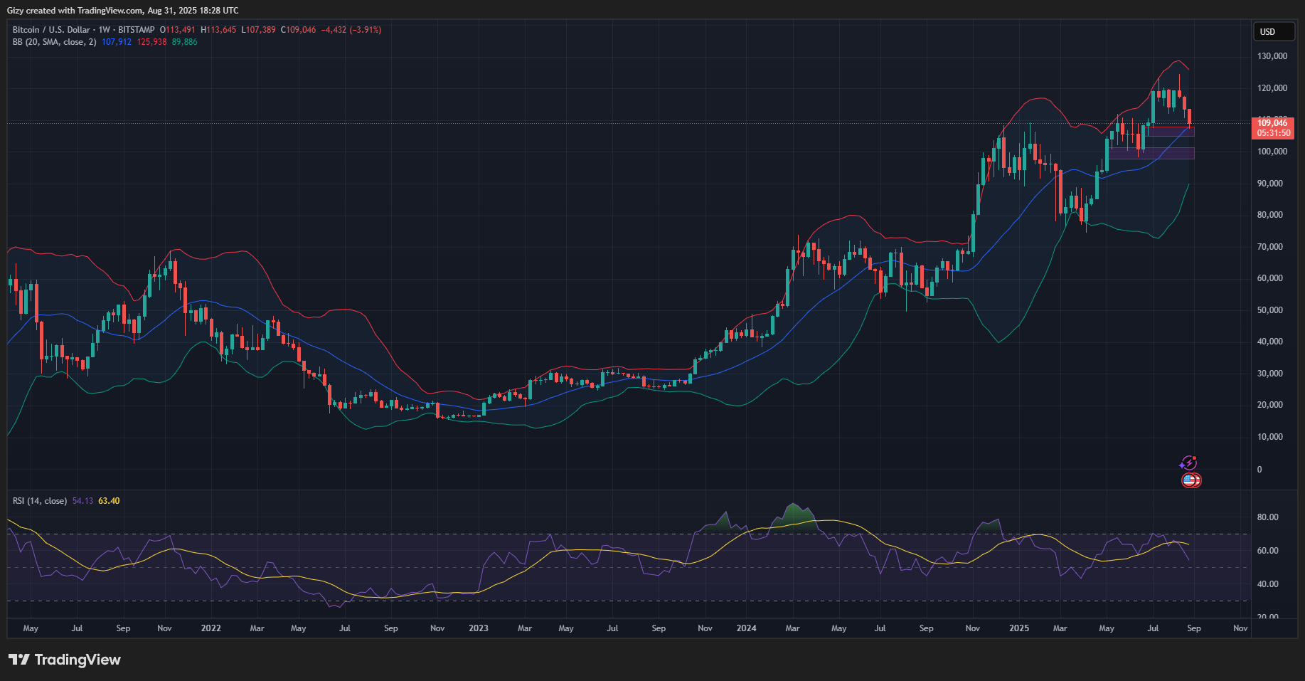 The 1-week chart indicates that Bitcoin is in a downtrend following a long-overdue correction. A closer look at the chart reveals several events that may affect the coin in September.