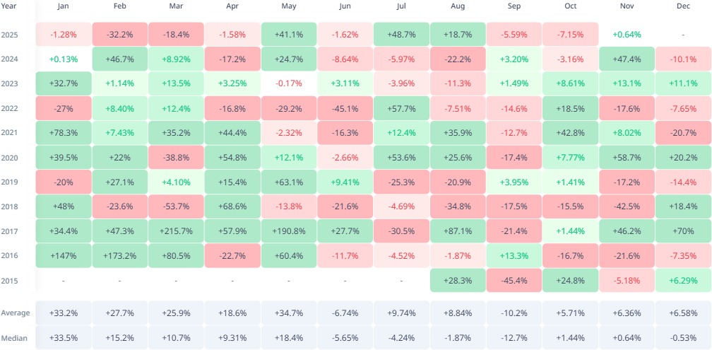 There are instances where prices went in different directions in both months. In 2019, when the asset increased slightly in October, massive losses followed in the next month. A similar event happened in 2022, while the reverse happened in 2024.
