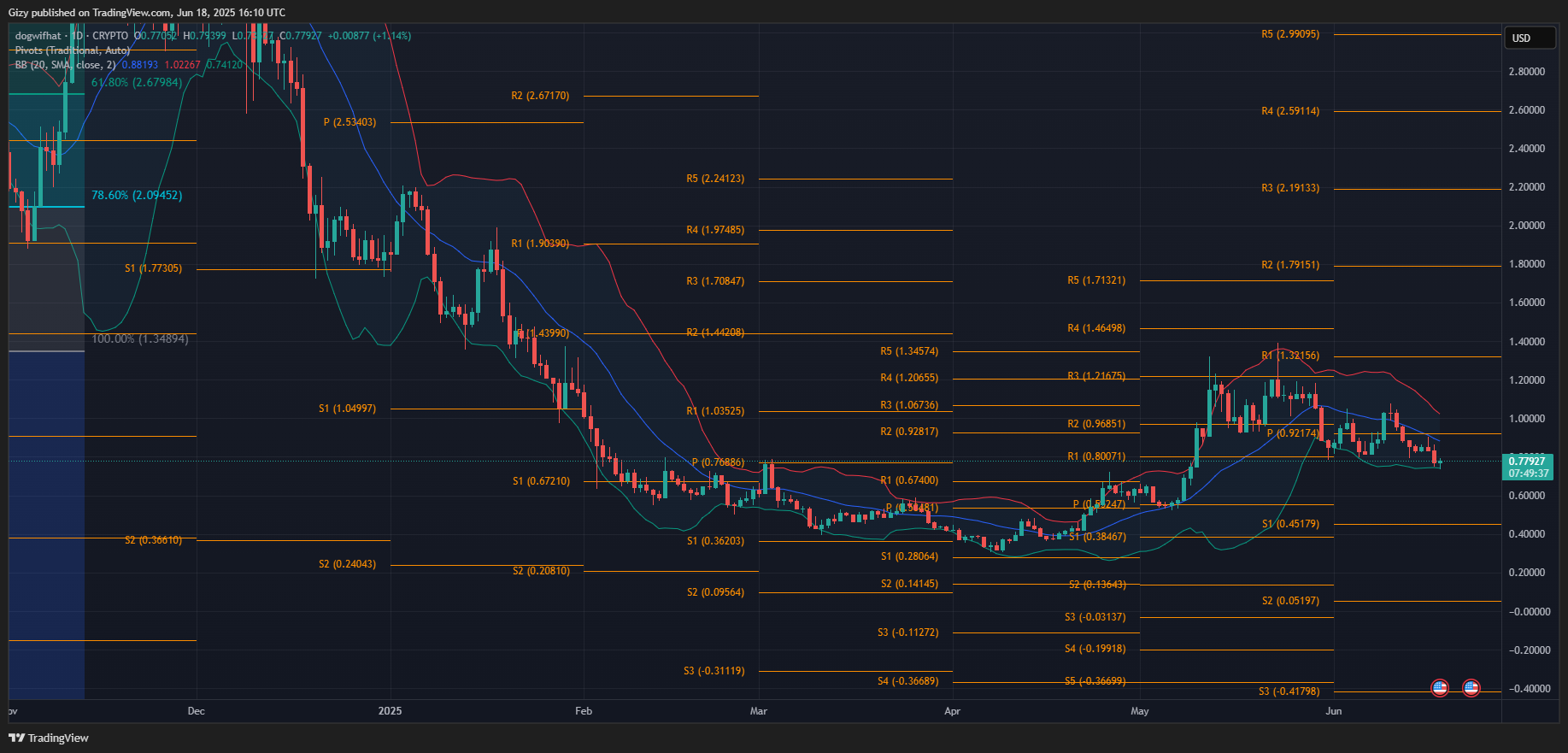 Dogwifhat prints a doji at the time of writing, indicating that it is experiencing equal buying pressure from the bears and buyers. Nonetheless, it edges closer to surging above $0.80.