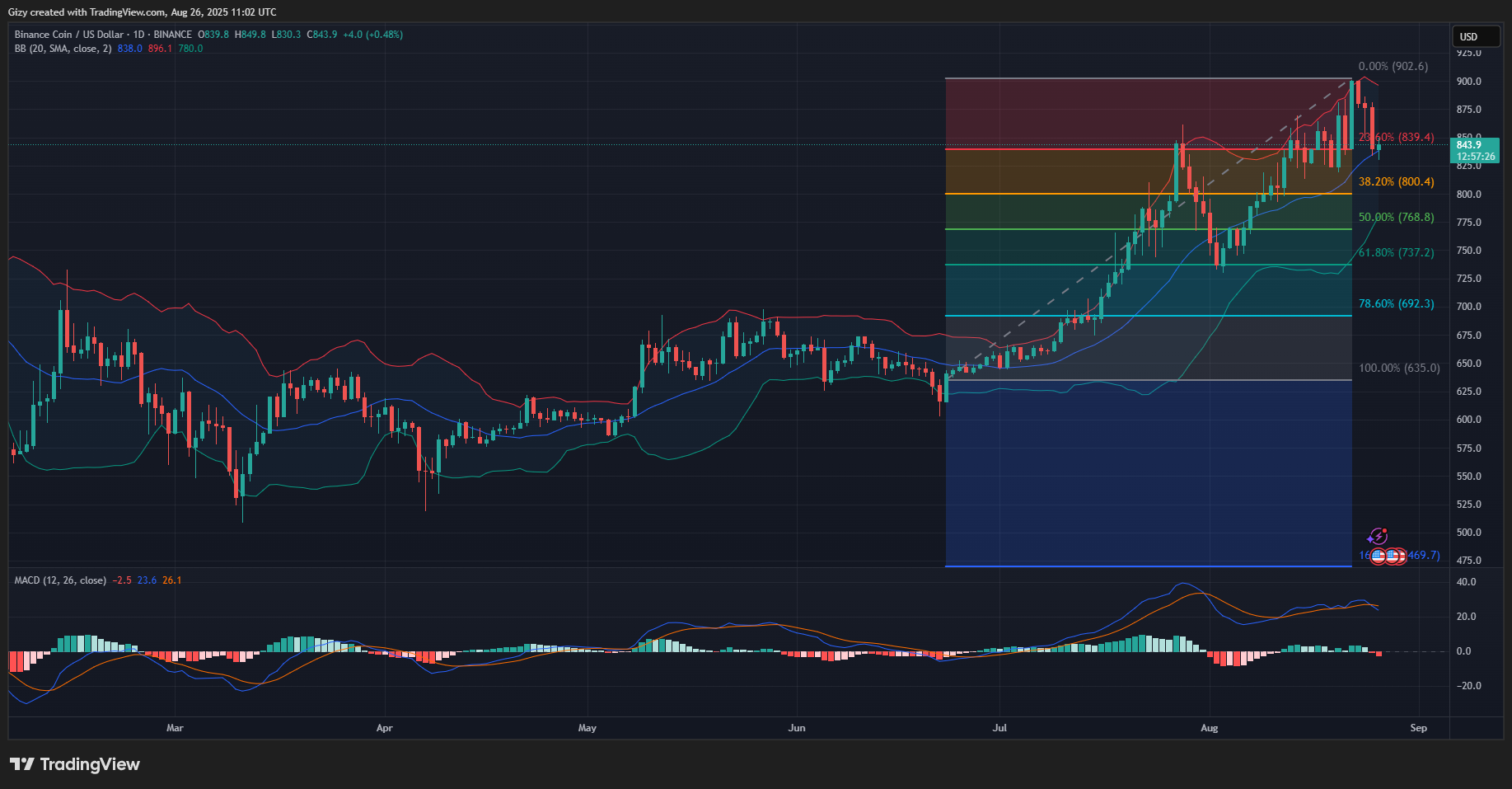 BNB mirrored SOL and the rest of the market on Monday as it retraced by over 4%. It lost the 23% fib level and dropped to a low of $834 before rebounding.