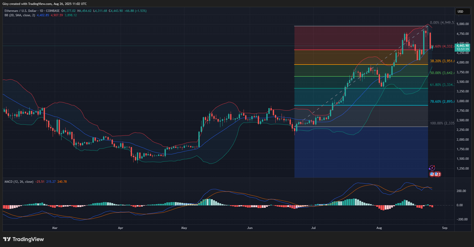 Ethereum is printing a green candle on Tuesday as it sees a slight recovery. However, it is as the bulls are yet to stage any significant rallies. Nonetheless, the coin started trading at $4,377 and peaked at $4,454 a few hours ago. It is worth noting that it retraced to a low of $4,311 before its slight increase.