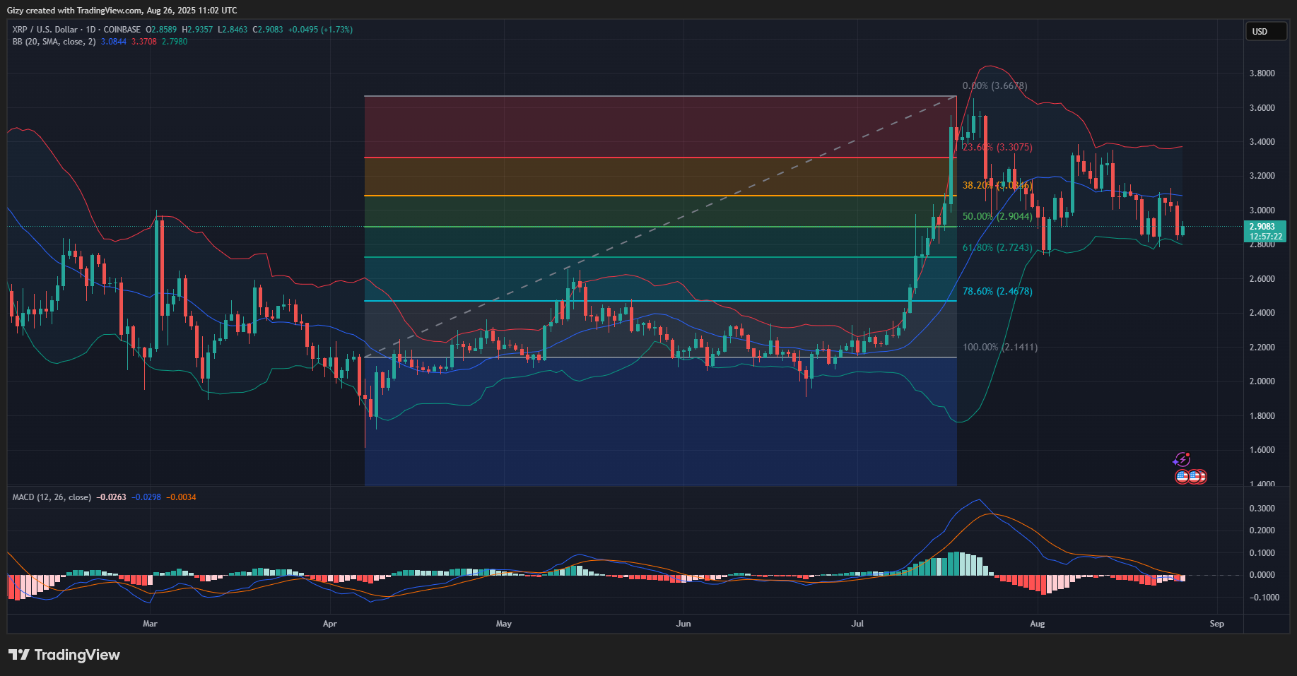XRP is grappling with notable selling pressure at the 50% fib level. It is crucial to keep this price, as the next mark is the 61% level at $2.72.