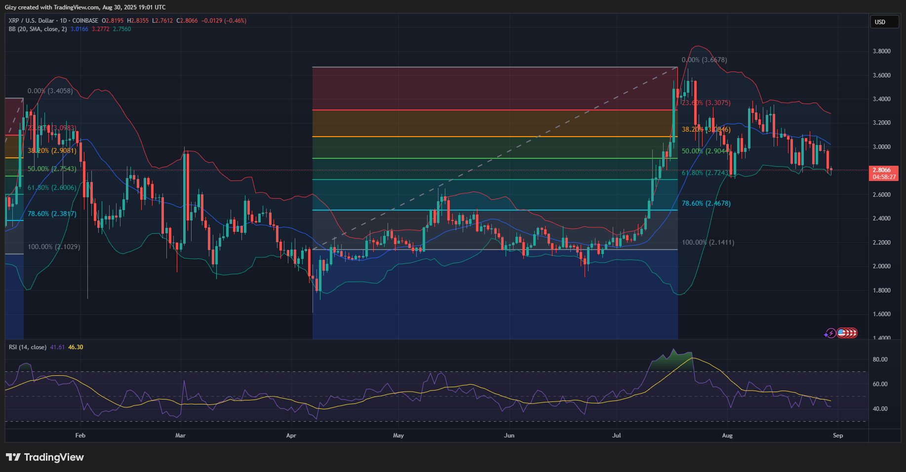 XRP is trading at $2.80 and has spent an extended period around this mark. Nonetheless, its current price depicts recovery from a slight decline to a low of $2.76, its lowest value since August 3.
