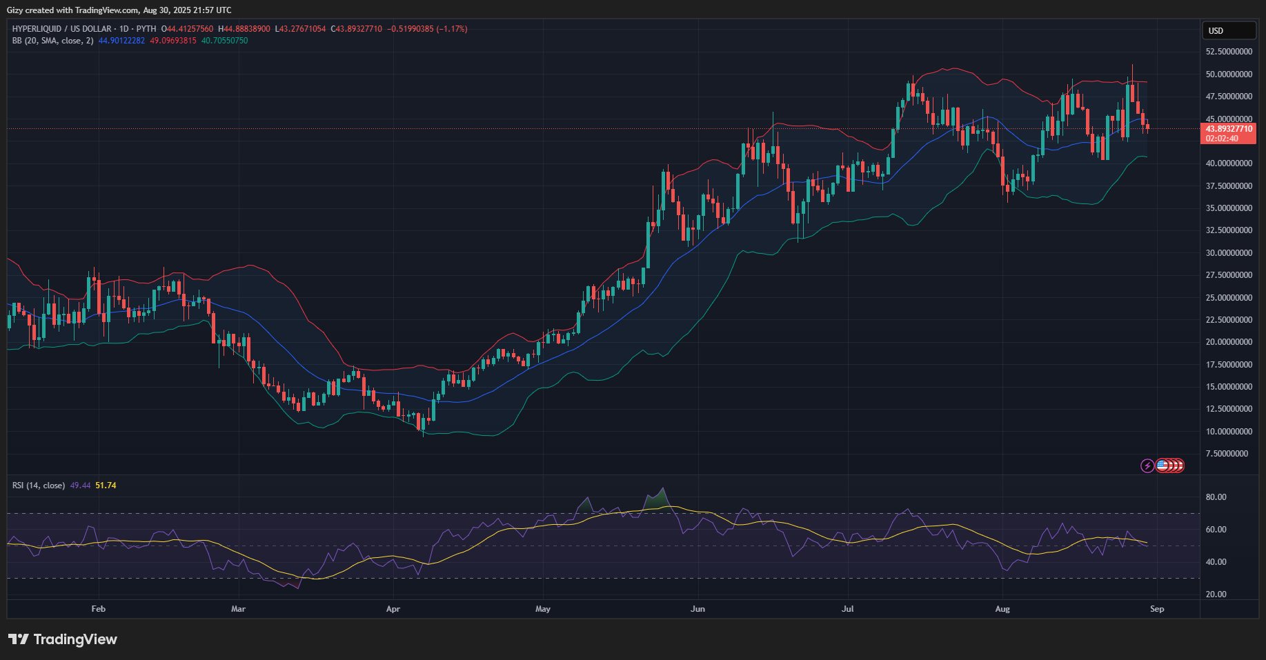 Tuesday was the most bullish day of the week for HYPE. It surged from $42.3 to a high of $49.7, closing with gains exceeding 13%. It attempted to continue the uptrend on Wednesday with limited success. The coin peaked at $51 but subsequently retraced, losing nearly 4%.
