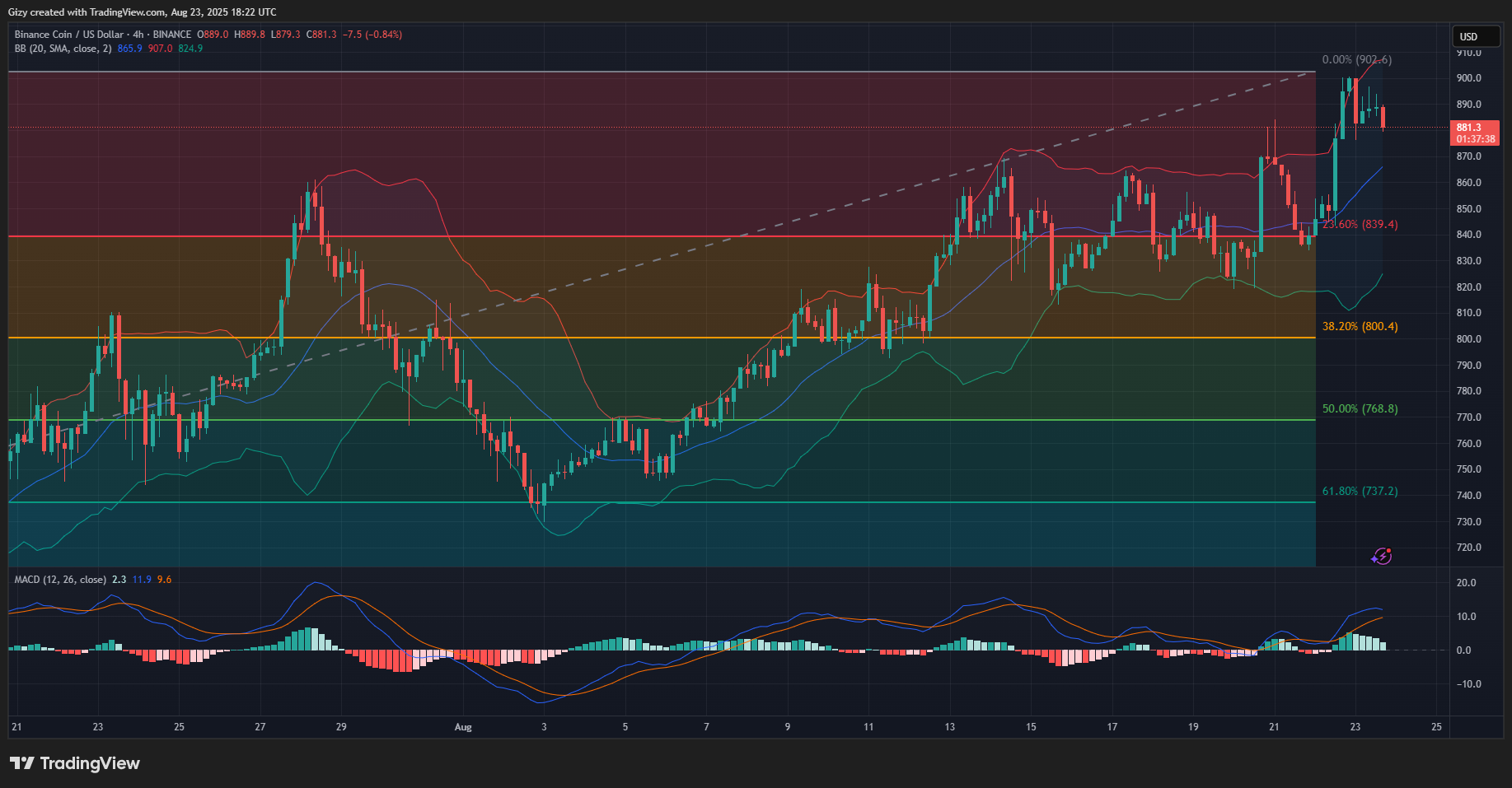 BNB started Saturday at $899 but retraced to $876. Although it trades slightly higher, the 4-hour chart indicates that it is still at risk of further price declines.
