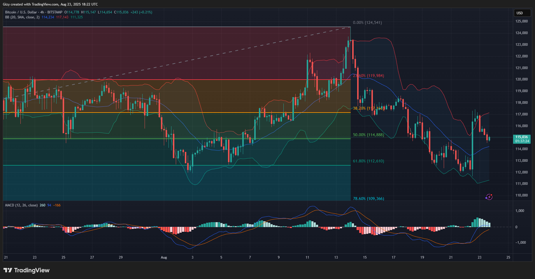 BTC is down by almost 2% and grapples with notable selling pressure at $114,800. Nonetheless, the 4-hour chart explains why the apex coin is in a downtrend. It broke above the bollinger bands during the previous intraday session.
