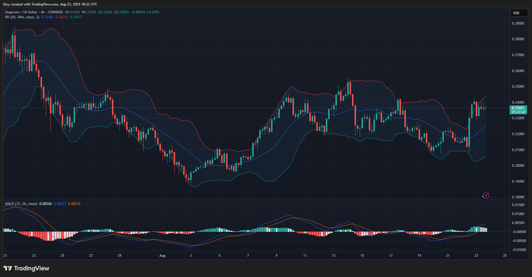 However, the bollinger bands suggest that the asset may retrace following the failed attempt at an uptick. The asset will drop below $0.23.