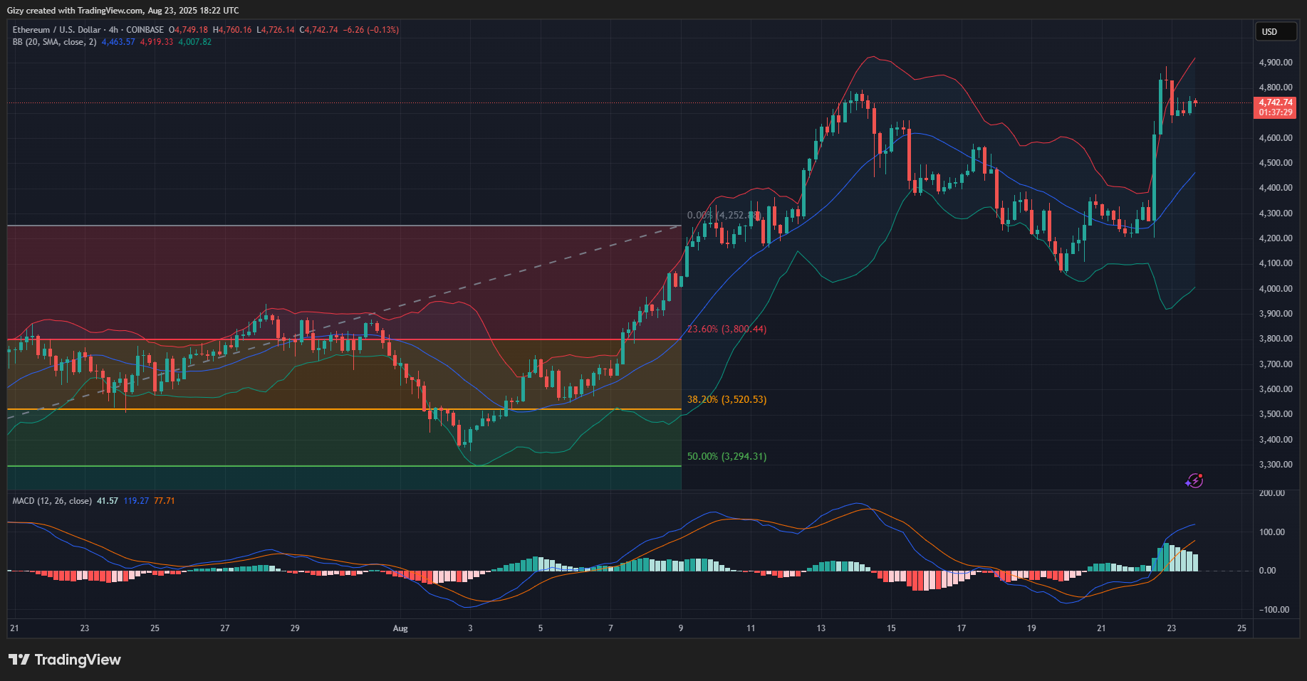 The 4-hour chart shows that most of the price declines started in the early hours of Saturday. ETH has since consolidated between $4,750 and $4,670. It printed three candles in this trend, indicating that it has lasted for more than 9 hours.