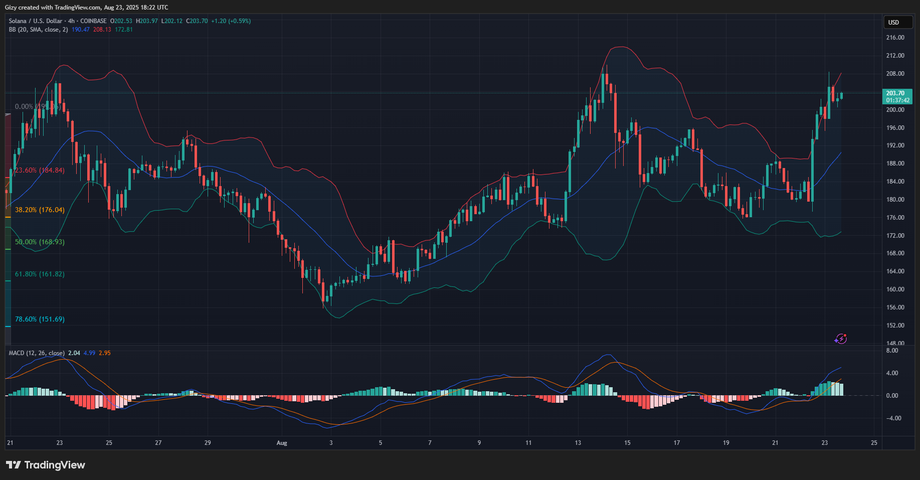 SOL peaked at $208 a few hours ago but trades lower as it lost momentum. Nonetheless, it is worth noting that the altcoin recovered a low of $196 before its latest increase.