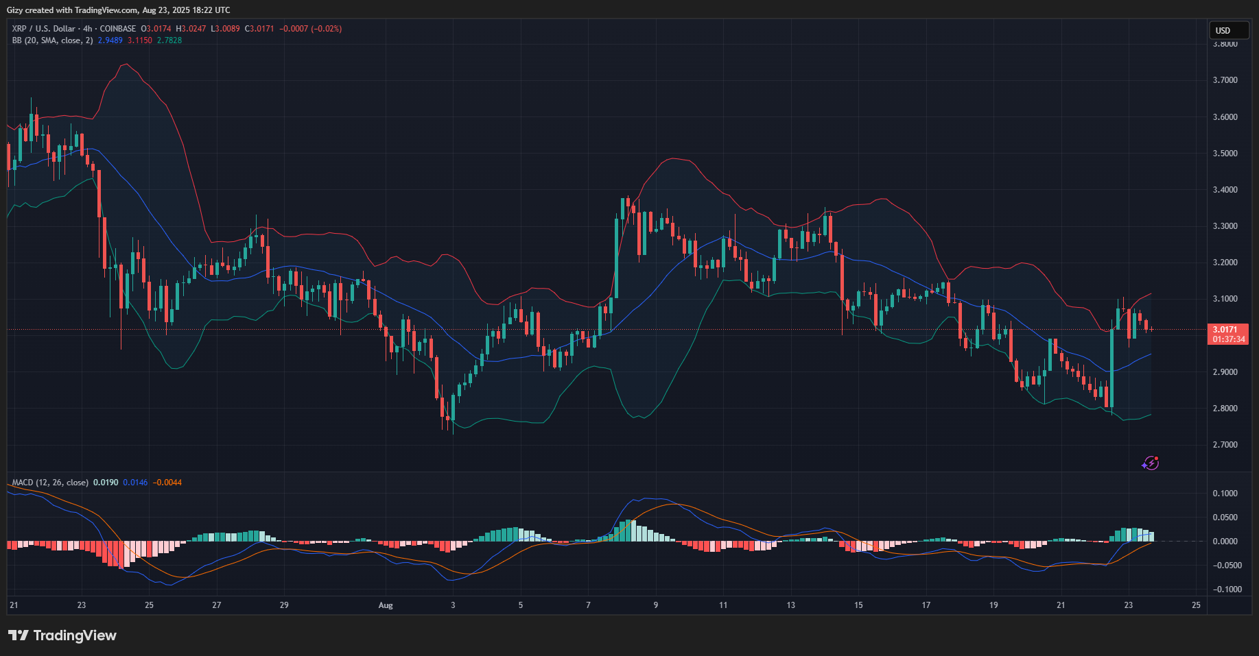 The bollinger band shows that XRP was trading above the upper band but is back within the indicator. However, the asset may continue downward, retesting the middle band at $2.95. It is worth noting that the drop in trading volume suggests diminished interest in the coin, which may be a recipe for further decline.